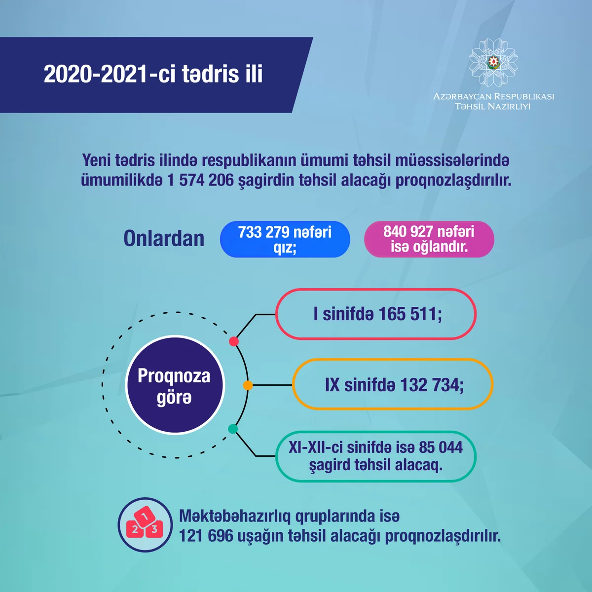 2020-2021-ci tədris ilinin əvvəlinə olan proqnoz göstəricilərinə əsasən, yeni tədris ilində respublikanın ümumi təhsil müəssisələrində ümumilikdə 1 574 206 şagirdin təhsil alacağı gözlənilir.