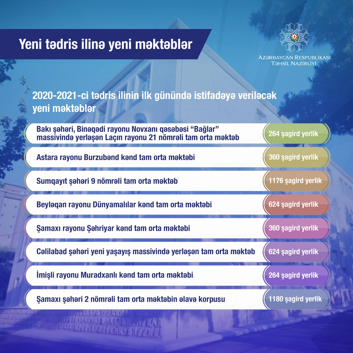İlin sonuna kimi Təhsil Nazirliyi tərəfindən təmir-tikinti işləri yekunlaşdırılmış 100-ə yaxın məktəb binası şagirdlərin istifadəsinə veriləcək, onlardan 60-ı modul tipli məktəbdir.