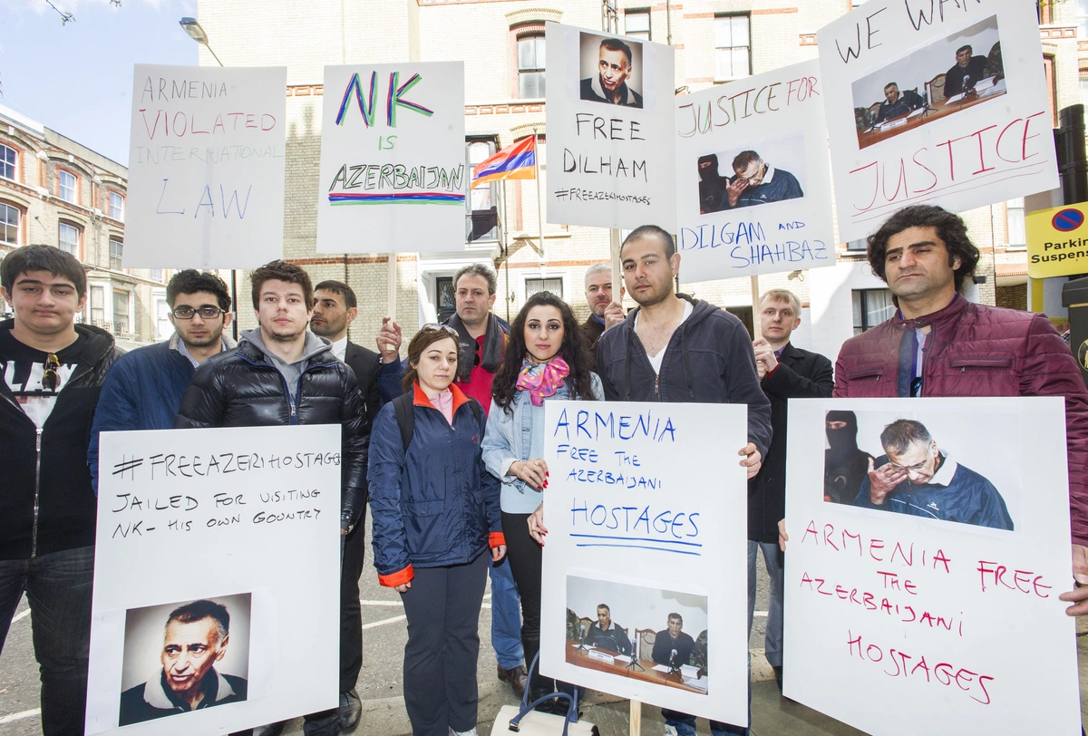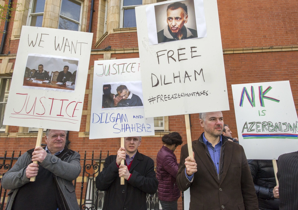 Baku. 20 April. REPORT.AZ/ A group of Azerbaijanis and supporters of international law demonstrated their solidarity with two innocent civilians taken hostage on their own homeland of Kelbajar – a region of Azerbaijan that has remained under illegal Armenian occupation for more than 20 years, Report informs. Standing outside the Armenian Embassy in London, they held placards and chanted slogans, reminding bypassers that Nagorno-Karabakh remains Azerbaijani territory and demanding justice for Dilham Asgarov (aged 54) and Shahbaz Guliyev (aged 46 years). These two Azerbaijanis were taken prisoner by Armenian forces in June 2014 when visiting their relatives’ graves. A third man – Hasan Hasanov (aged 38) – was shot dead. In December, an unrecognised court sentenced Dilham to life imprisonment and Shahbaz to 22 years in jail.
