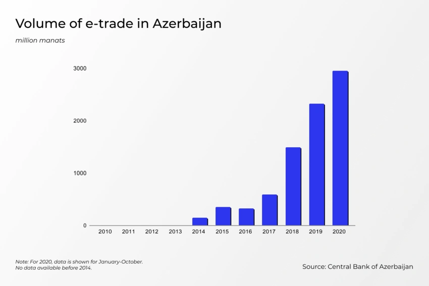 In 2020, amid travel restrictions due to coronavirus, e-commerce turnover in Azerbaijan increased from 34.7 million to 54.78 million transactions. In value terms, the growth was 27%, up to AZN 2.95 billion.