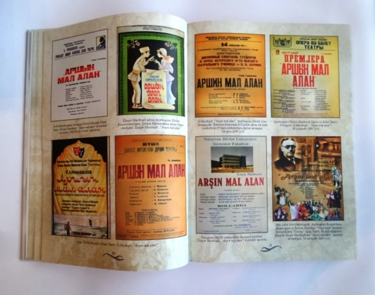 The book was developed of 3 subheadings named "Arshin mal alan on the Azerbaijani stage", "Arshin mal alan on the screens" and "Arshin mal alan in languages and on stages of various countries".