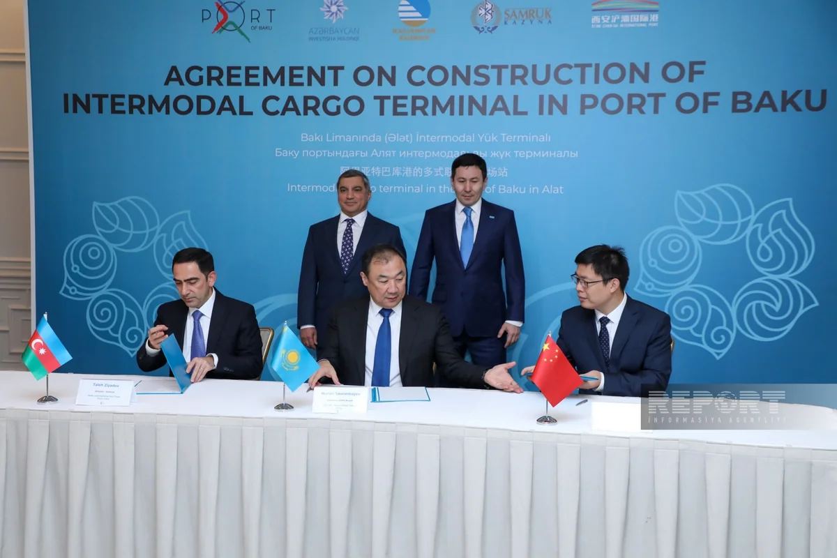 Report informs that the agreement was signed by Taleh Ziyadov, Director General of Baku International Sea Trade Port CJSC, Nurlan Sauranbayev, Chairman of the Board of Kazakhstan Railways SC, and Yuan Xiaojun, General Manager of Xi'an Free Trade Port Construction and Operation Co Ltd.