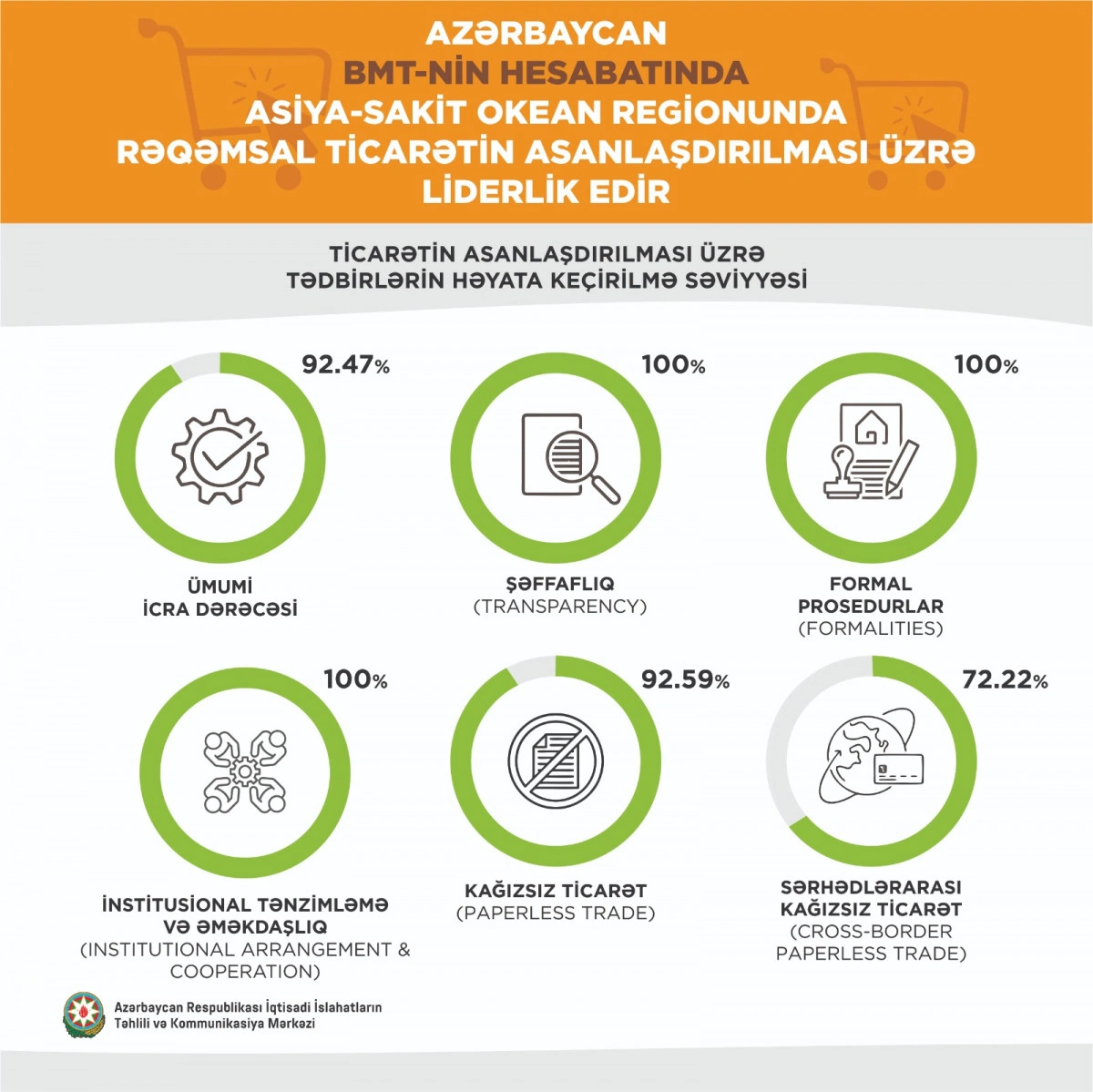 The department head of the center, Nijat Hajizada, stated that Azerbaijan achieved a very high result by demonstrating 100% effectiveness in transparency, formal procedures, institutional cooperation and coordination indicators included in trade facilitation, 92.6% in paperless trade, and 72.2% in cross-border paperless trade.