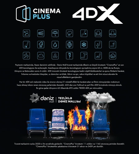 Azerbaijan's biggest CinemaPlus cinema theater with state-of-the-art 4DX technology will open at Deniz Mall shopping center on the Caspian Sea shore.