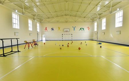 The three-storey school consists of five buildings. The school has 18 classrooms, labs, a library, a canteen, an assembly hall and a gym.