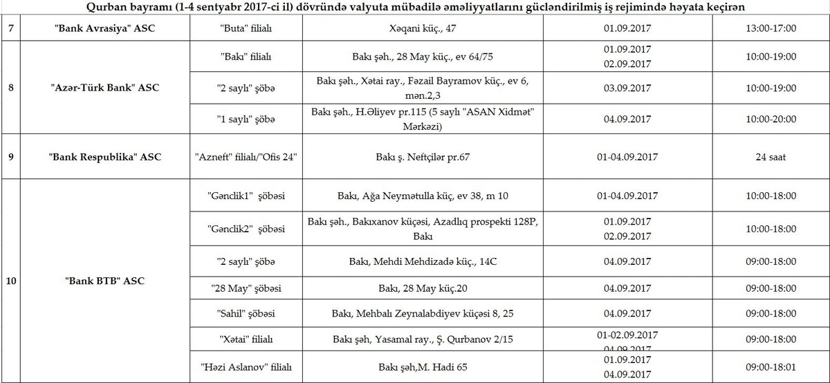 76 structural divisions of 23 banks will render services in the capital and regions to provide comfortable access to currency exchange services during holidays. 2 branches and 2 departments of 4 banks in Baku will operate 24/7.