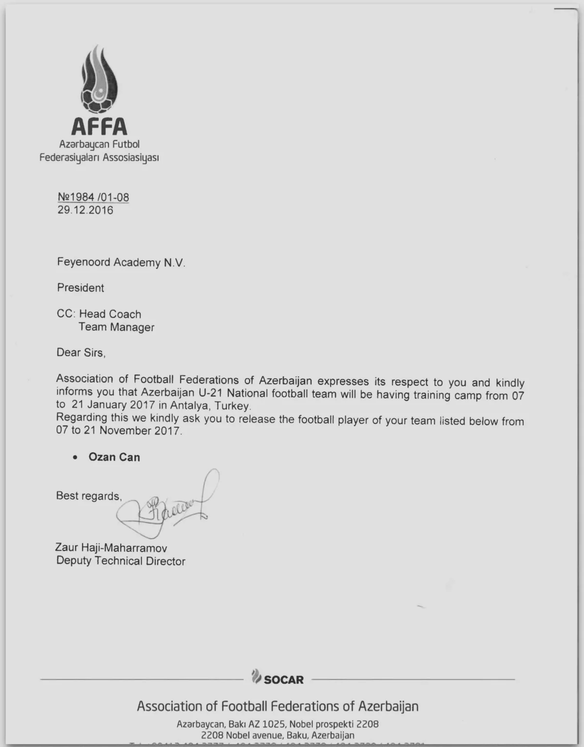 Baku. 30 December. REPORT.AZ/ AFFA sent an offer to Turkish-origin player of Netherlands’ Feyenoord club Ozancan Kökcü.
