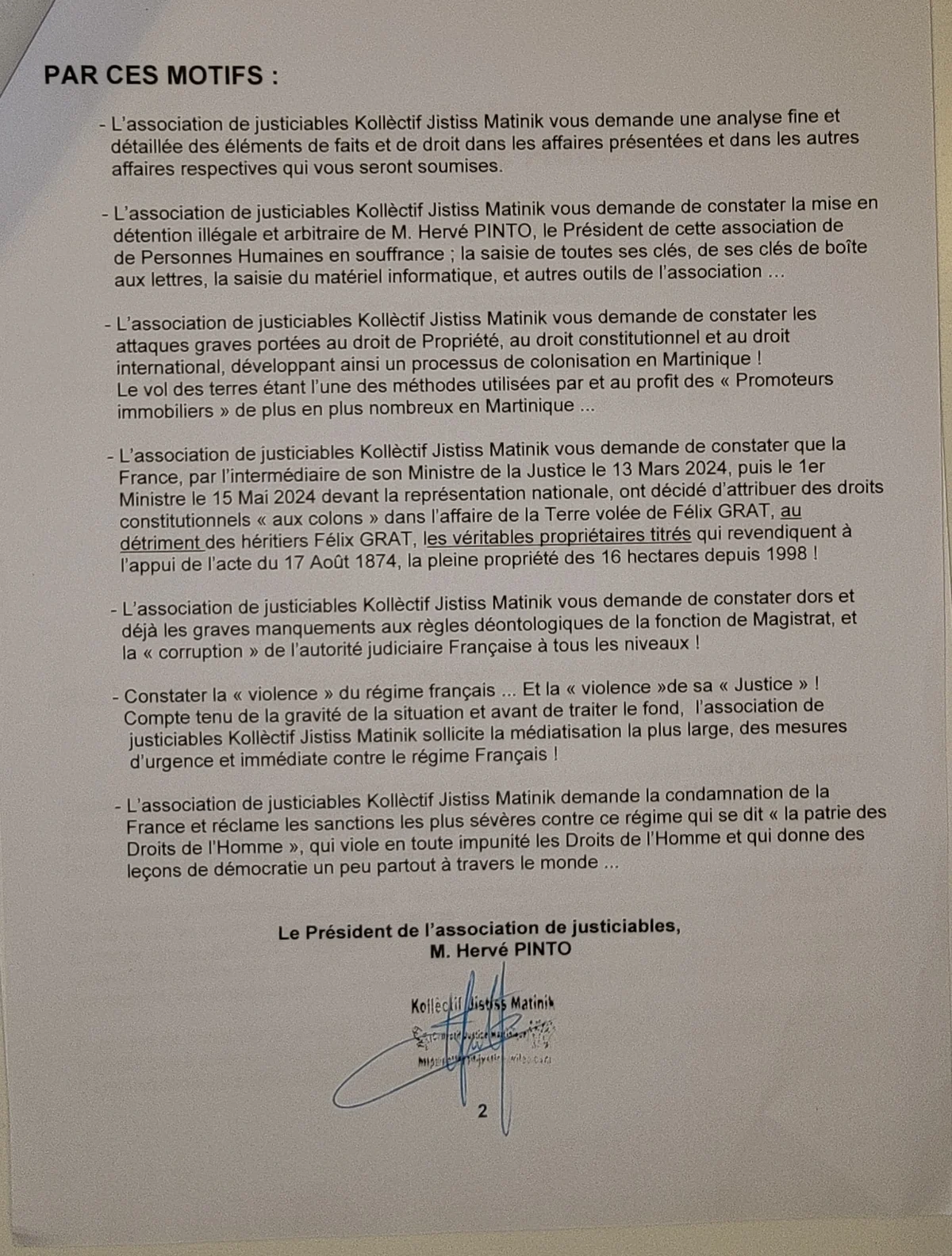 According to Maurice Ingargiola, the French government has been seizing land from the Martinican people and imprisoning individuals under false pretenses: “Herve Pinto, the president of our organization, was unlawfully arrested and had all his property confiscated after denouncing the rampant corruption in the French judicial system. Hervé Pinto is just one of the hundreds of our people who have fallen victim to France's injustice and cruelty," Arnaud Maurice Ingargiola stated. "The land inherited from our forefathers is being forcibly taken away from us. According to the country's real estate laws, anyone living on our land can claim ownership by presenting false witnesses."