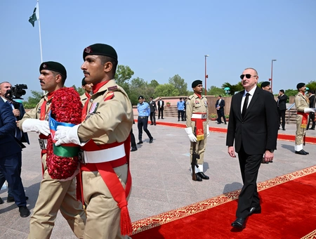 A guard of honor was lined up for President Ilham Aliyev at the square, decorated with the national flags of Azerbaijan and Pakistan.