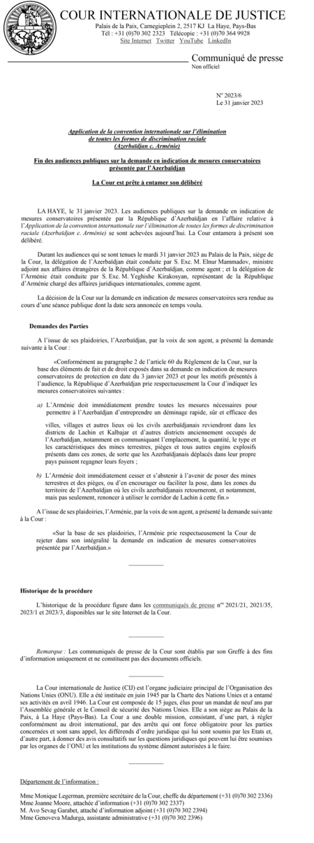 On January 31, 2023, the International Court of Justice (ICJ) held public hearings on Azerbaijan’s request for the indication of additional provisional measures submitted in the case concerning the Application of the International Convention on the Elimination of All Forms of Racial Discrimination (CERD) (Azerbaijan v. Armenia).