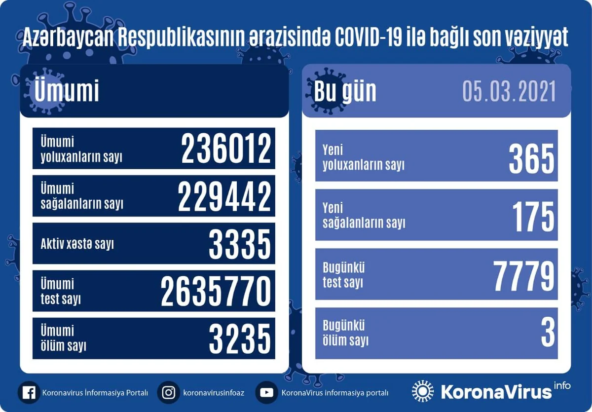 So far, 236,012 people have contracted the virus in Azerbaijan, 229,442 have recovered, while 3,235 have died. At present, 3,335 people are receiving treatment.