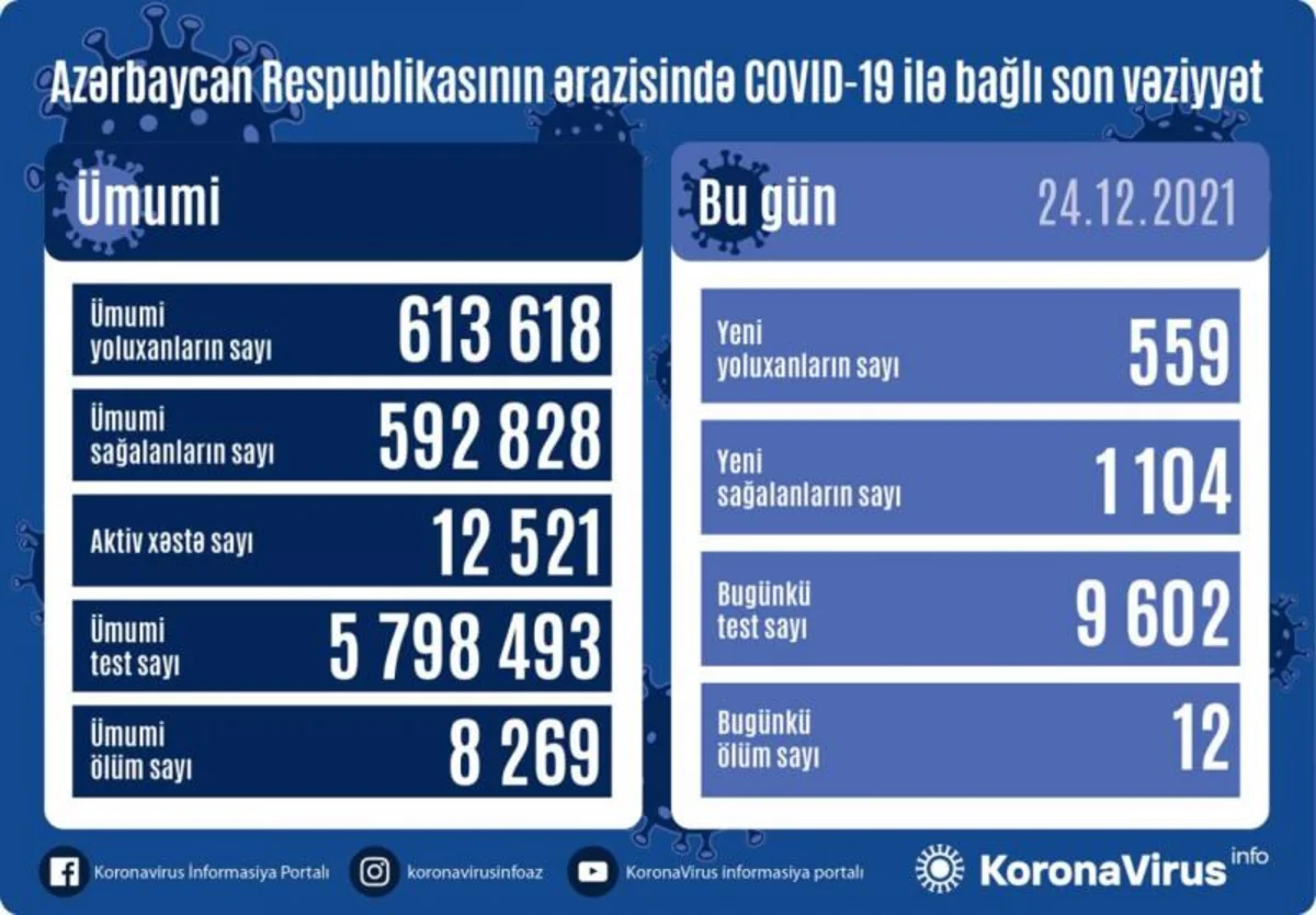 Azerbaijan confirmed 559 new cases, 1,104 recoveries, and 12 deaths on December 24.