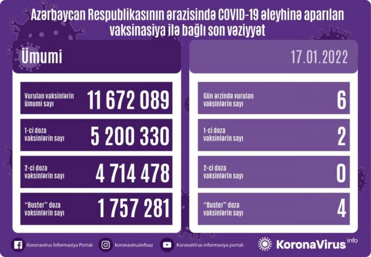 A total of 6 vaccine shots were made against coronavirus in Azerbaijan on January 17, Report informs, citing the operational headquarters under the Cabinet of Ministers.