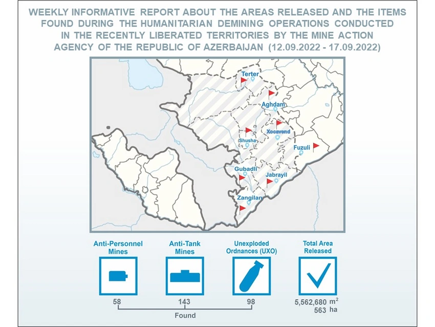 According to ANAMA, 58 antipersonnel mines, 143 anti-tank mines, and 98 unexploded ordnances were found and neutralized during mine clearance operations in Tartar, Aghdam, Fuzuli, Shusha, Gubadli, Jabrayil, and Zangilan on September 12-17.