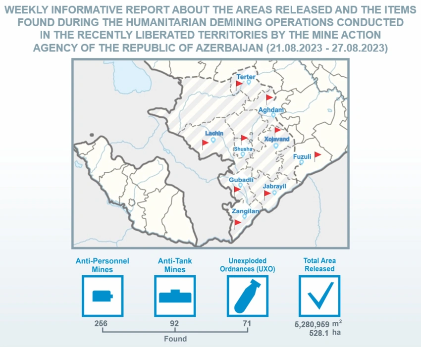 According to ANAMA, 256 anti-personnel mines, 92 anti-tank mines, and 71 unexploded ordnance were found and neutralized during mine clearance operations in Tartar, Aghdam, Khojavand, Fuzuli, Shusha, Gubadli, Jabrayil, and Zangilan.