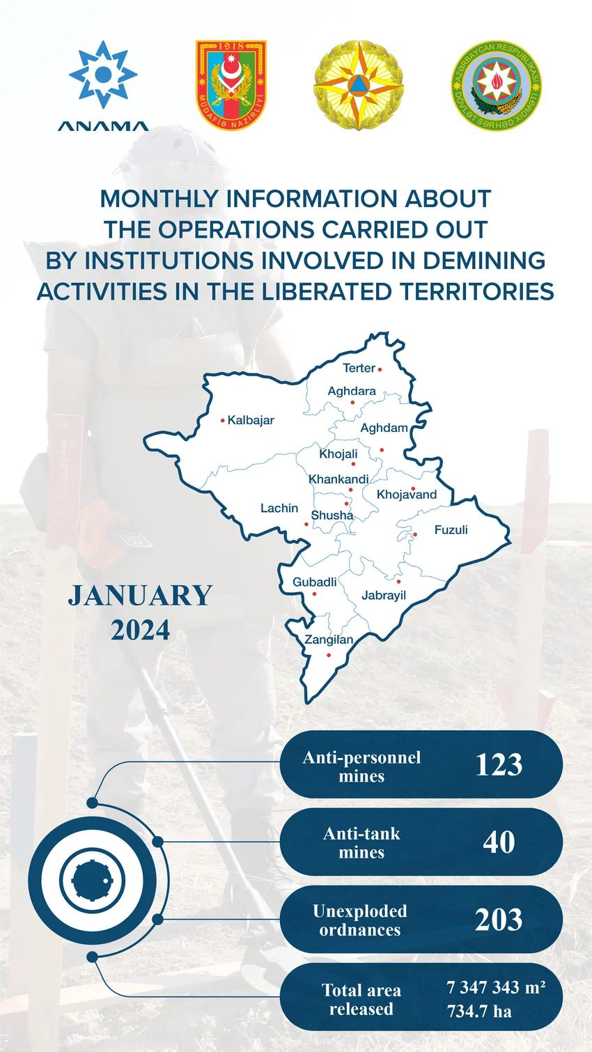According to ANAMA, 123 anti-personnel mines, 40 anti-tank mines, and 203 unexploded ordnance were found and neutralized during mine clearance operations in the liberated territories.