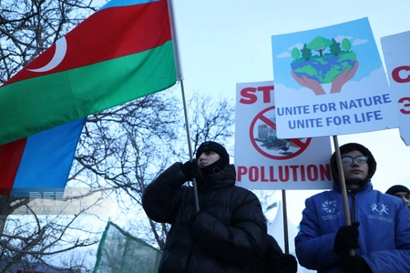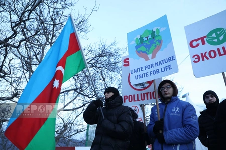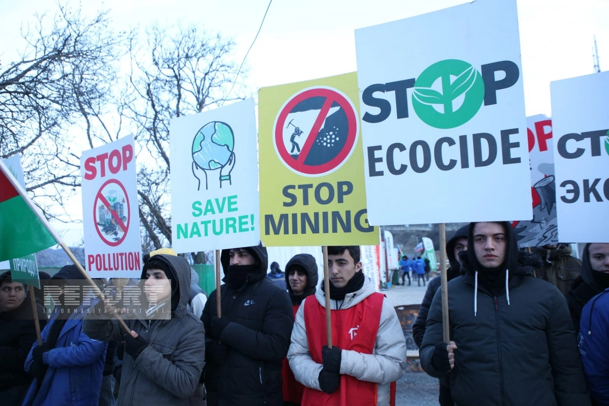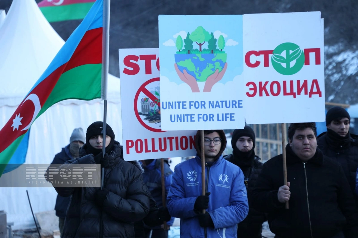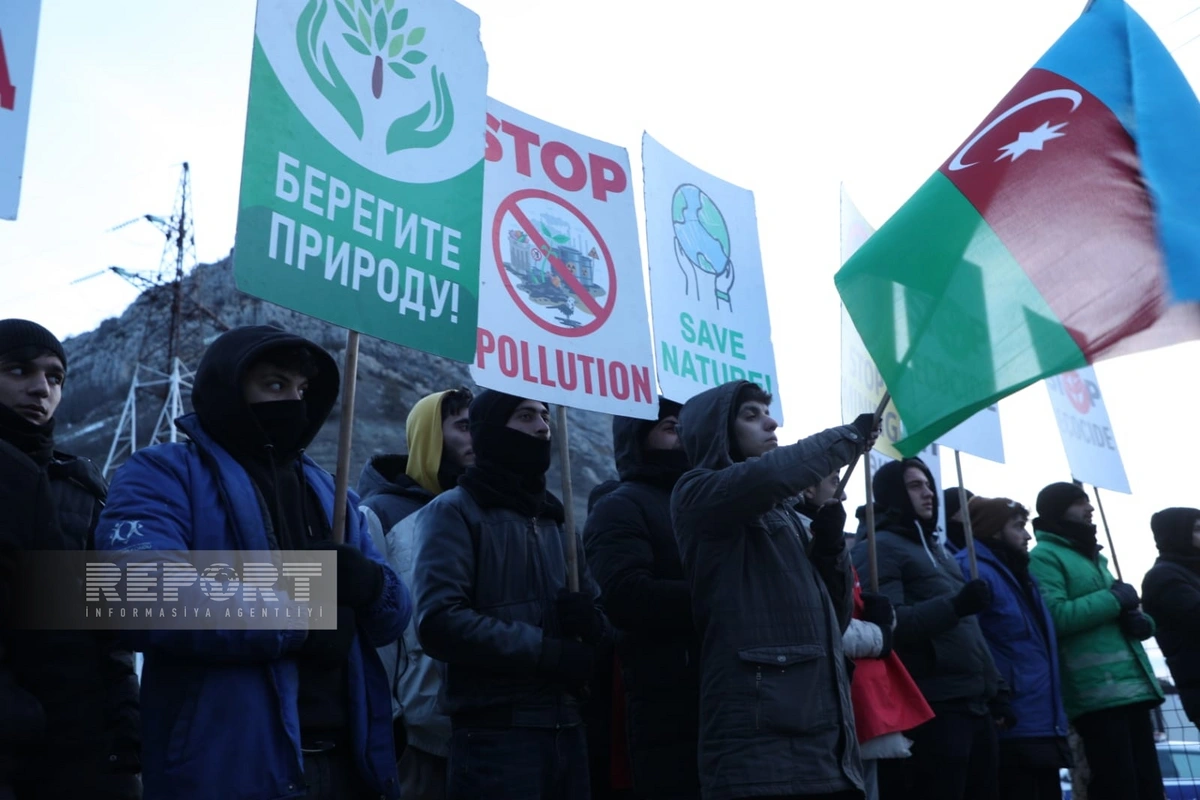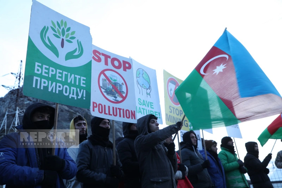 At the same time, the eco-activists raise posters written in Azerbaijani, Russian and English on both sides of the road and chant slogans.