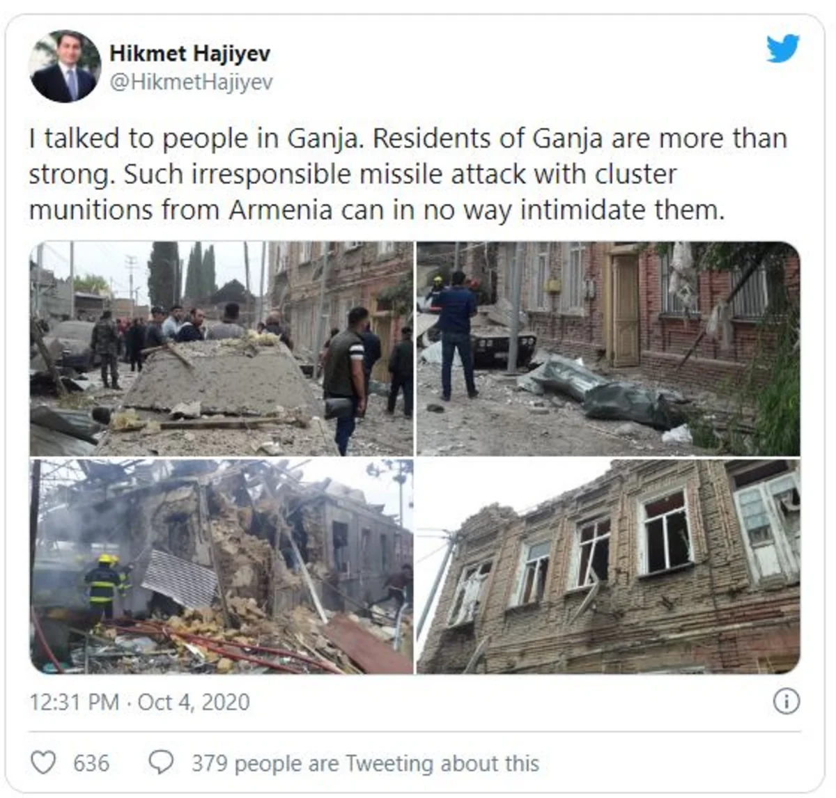 "I talked to people in Ganja. The residents of Ganja are more than strong. Such irresponsible missile attack with cluster munitions from Armenia can in no way intimidate them."
