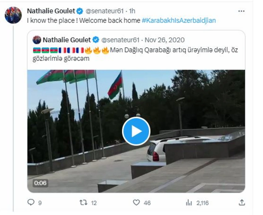 She recalled her publication made back in November 2020, when the French senator wrote that she would see Karabakh not only with her heart, but also with her own eyes.