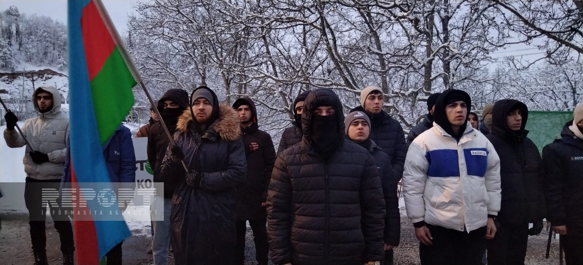 Despite the frosty and snowy weather, eco-activists are raising posters in Azerbaijani, Russian, and English on both sides of the road and chanting slogans without hindering the movement.