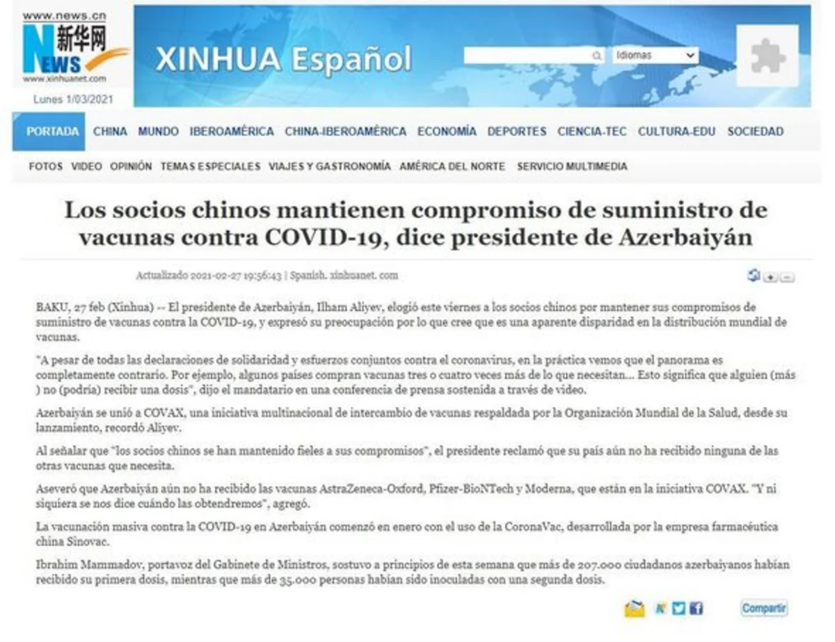 On February 26, President of Azerbaijan Ilham Aliyev praised the Chinese partners for fulfilling their obligations on the supply of vaccines against COVID-19 while expressing concern over the apparent inequality in the global distribution of the vaccines.