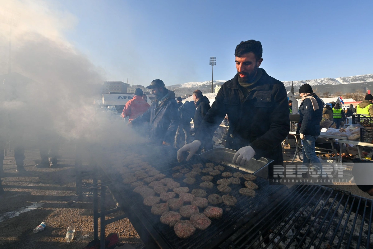 People housed in the camp established by the emergency management authority, AFAD, at the February 12 Stadium are provided with food, water and tea during the day, and are given warm clothes.