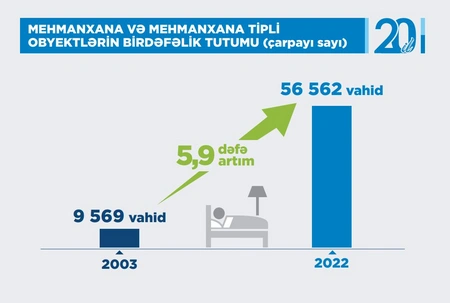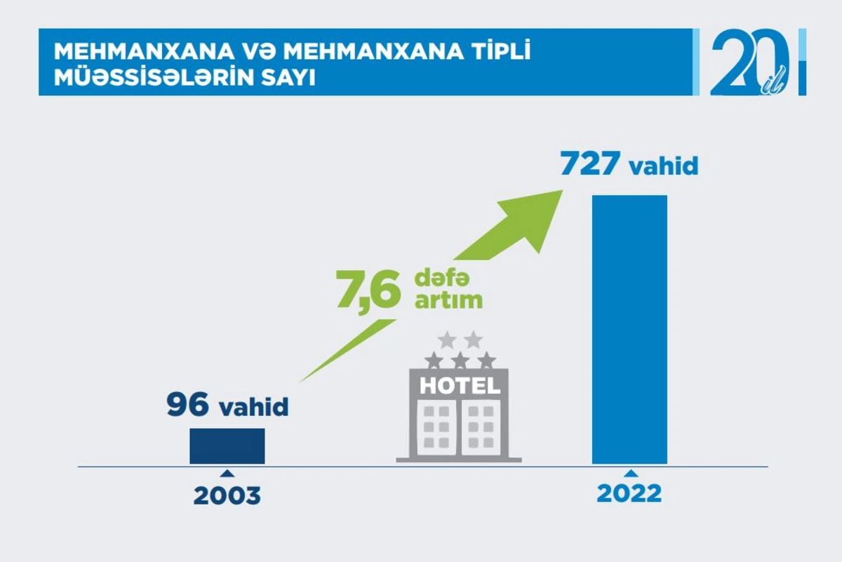 From 2003 to 2022, the number of hotels and hospitality enterprises in Azerbaijan increased by 7.6 times and reached 727, and the one-time capacity of these facilities increased by 5.9 times.