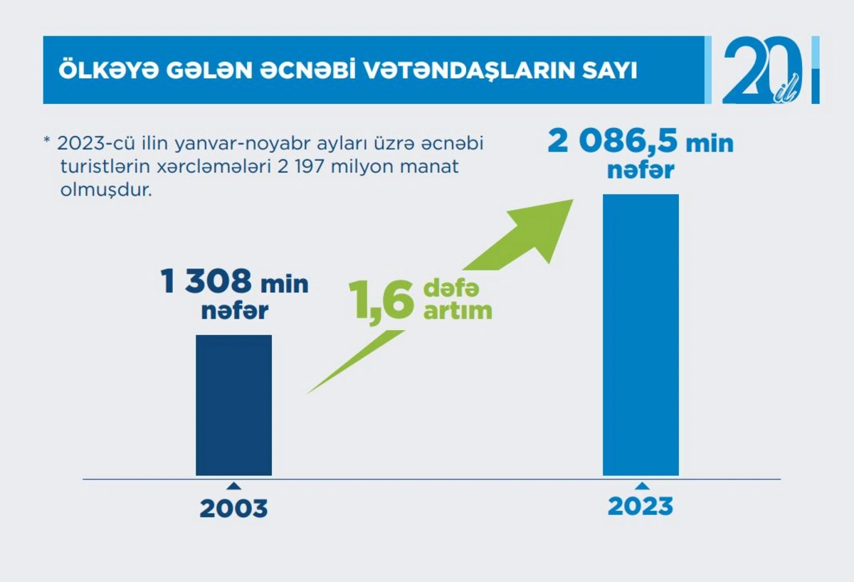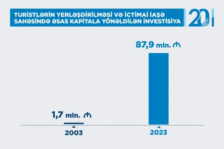 Over the past 20 years, investments in fixed assets in the field of tourist accommodation and catering have increased 51.7 times and amounted to 87.9 million manats ($51.705 million).