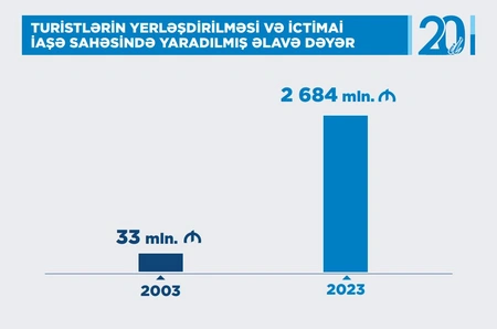 The added value created in Azerbaijan in the field of tourist accommodation and catering amounted to 35 million manats ($20.588 million) in 2003, and 2.684 billion manats ($1.578 billion) in 2023, which is 76.6 times more, Report informs.