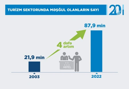 Over these years, the number of people employed in the tourism sector of Azerbaijan has grown from 21.9 million to 87.9 million, which is four times more.