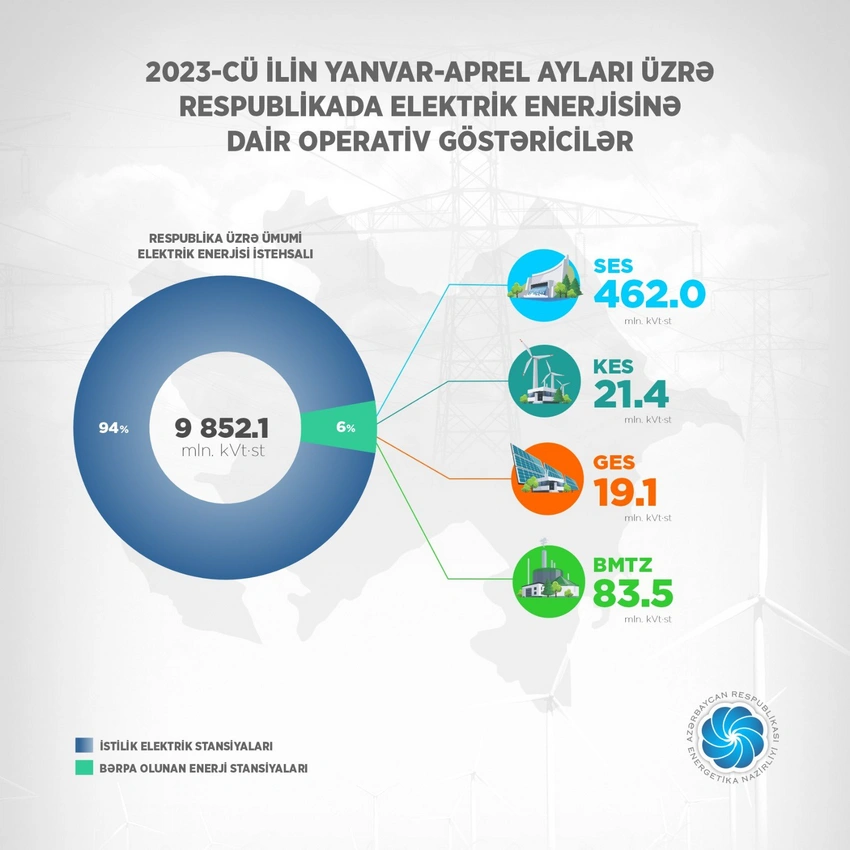 Bu ilin yanvar-aprel aylarında Azərbaycanda İstilik Elektrik Stansiyaları (İES) üzrə 9 milyard 266,1 milyon kVt/saat elektrik enerjisi istehsal edilib.