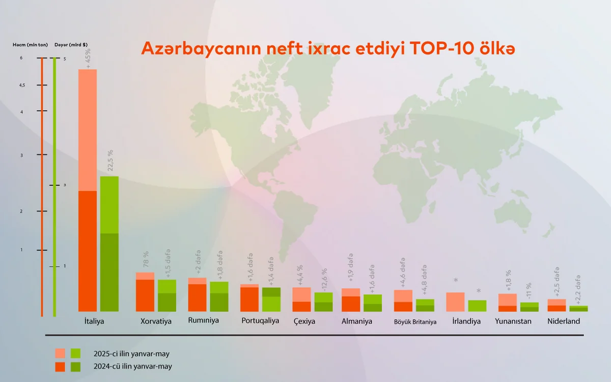 Bu ilin beş ayında Azərbaycan İtaliyaya 3 milyard 88 milyon 100,61 min ABŞ dolları dəyərində 5 milyon 730 min 746,71 ton, Xorvatiya 408 milyon 862,68 min ABŞ dolları dəyərində 744 min 703,91 ton, Rumıniya 377 milyon 106,29 min ABŞ dolları dəyərində 683 min 725,65 ton xam neft ixrac edib. Portuqaliya 310 milyon 369,1 min ABŞ dolları dəyərində 576 min 34,89 ton və Çexiya 304 milyon 667,44 min ABŞ dolları məbləğində 558 min 693,27 ton neft tədarük edilib.