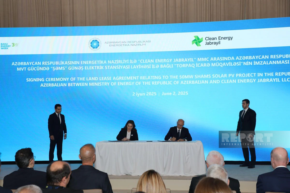 Azad edilmiş ərazilərin “yaşıl enerji zonası”na çevrilməsi məqsədilə həyata keçirilən təşəbbüslər çərçivəsində, Cəbrayıl rayonunda tikilməsi planlaşdırılan iki günəş elektrik stansiyası üzrə də müqavilələr imzalanıb. 50 MVt gücündə “Üfüq” GES və 50 MVt gücündə “Şəms” GES layihələri üzrə “Torpaq icarə müqavilə”lərini energetika naziri Pərviz Şahbazov, “Enerso Jabrayil” MMC şirkətinin direktoru Eldar Məmmədzadə və “Clean Energy Jabrayil” MMC-nin direktoru Xəyalə Nağıyeva imzalayıb. Hər iki layihəyə dair “Enerji alqı-satqı müqavilə”ləri və “Ötürücü şəbəkəyə qoşulma müqavilə”ləri də imzalanıb.