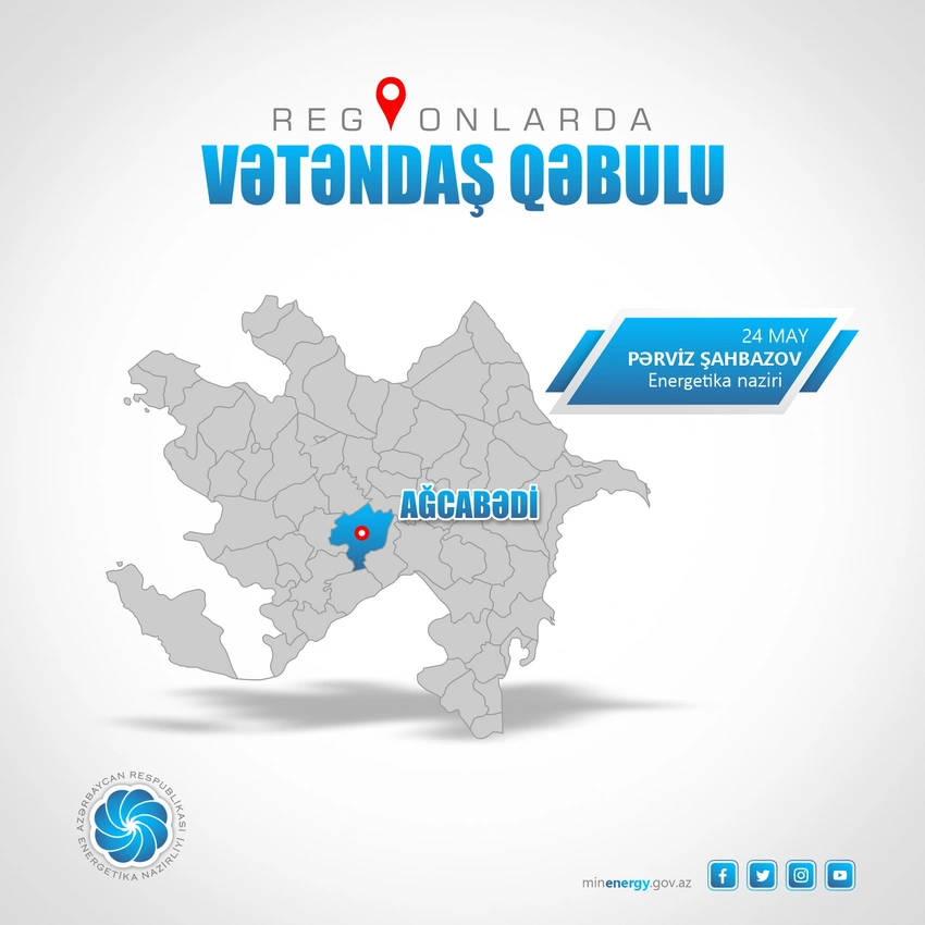 Mayın 24-də energetika naziri Pərviz Şahbazov Ağcabədi, Beyləqan, Füzuli, Ağdam, Bərdə, Zərdab və Xocavənd rayonlarından olan vətəndaşları qəbul edəcək.