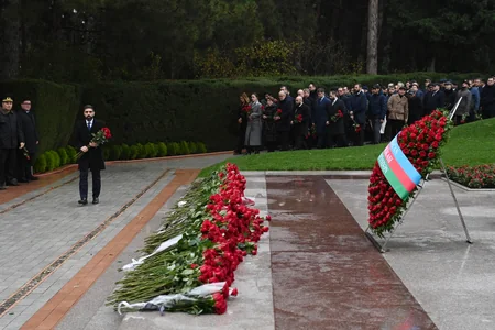 Bildirilib ki, dahi şəxsiyyətin əziz xatirəsini dərin ehtiram və minnətdarlıqla anaraq məzarı önünə əklil və gül dəstələri qoyublar.