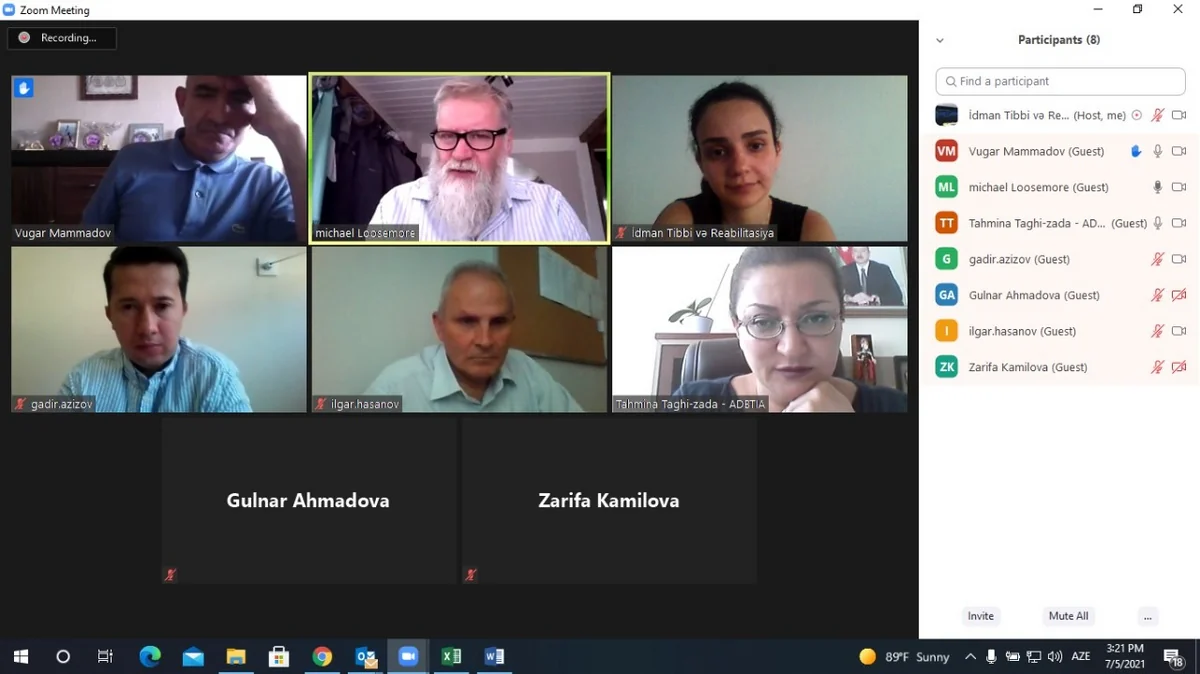 Onlayn müsahibədə “İdman tibbi və reabilitasiya” magistr ixtisası standartının müəllifi, London Kollec Universitetinin professoru və ISEH institutunun aparıcı eksperti Maykl Pol Luzmor, sağlamlıq hüququ üzrə Avropa Assosiasiyasının vitse-prezidenti professor Vüqar Məmmədov, ADBTİA-nın tədris və elmi işlər üzrə prorektoru Təhminə Tağı-zadə və “İdman tibbi və reabilitasiya” kafedrasının müdiri, tibb elmləri doktoru İlqar Həsənov namizədlərin seçilməsində komissiya üzvləri kimi iştirak ediblər.