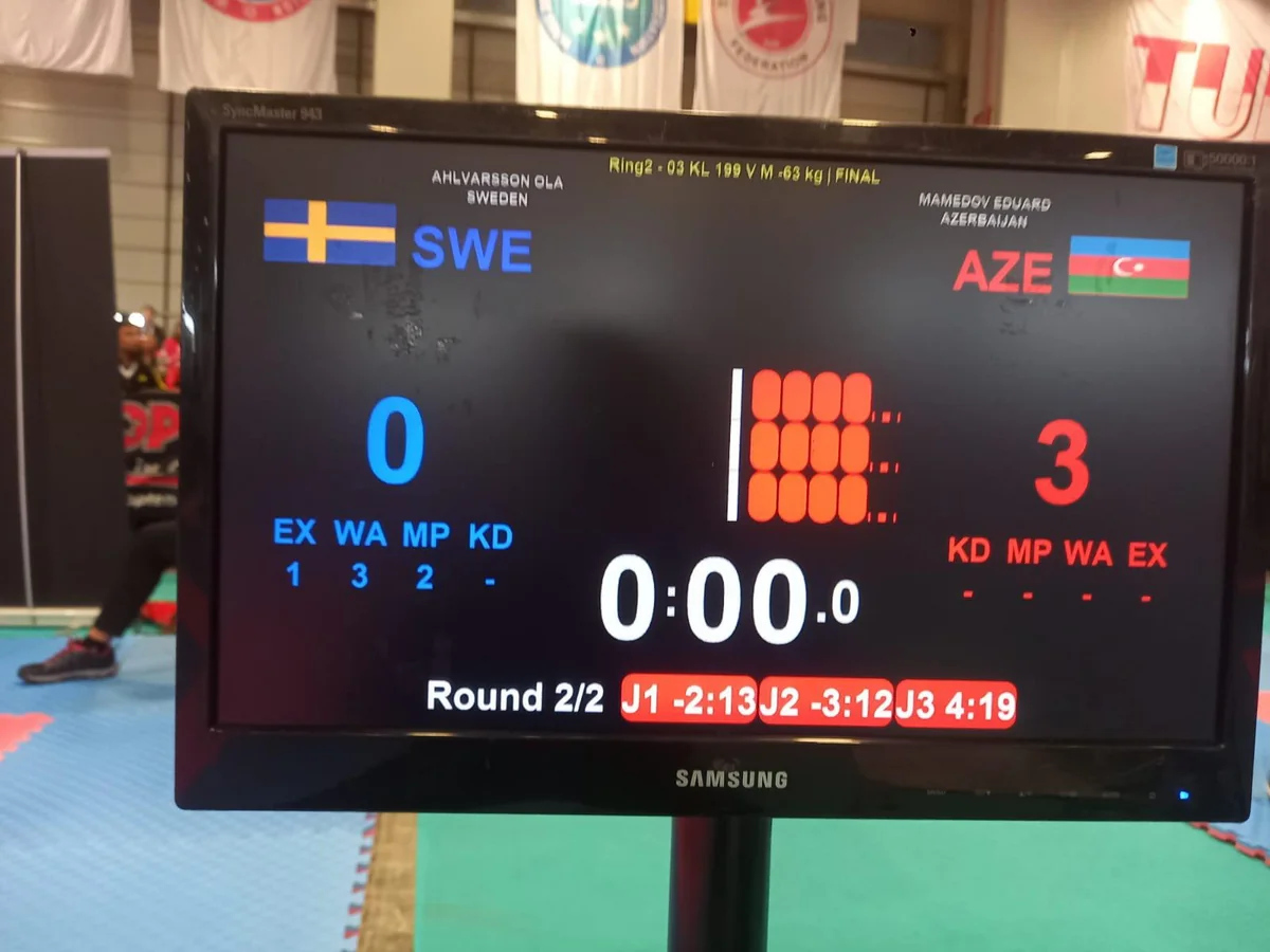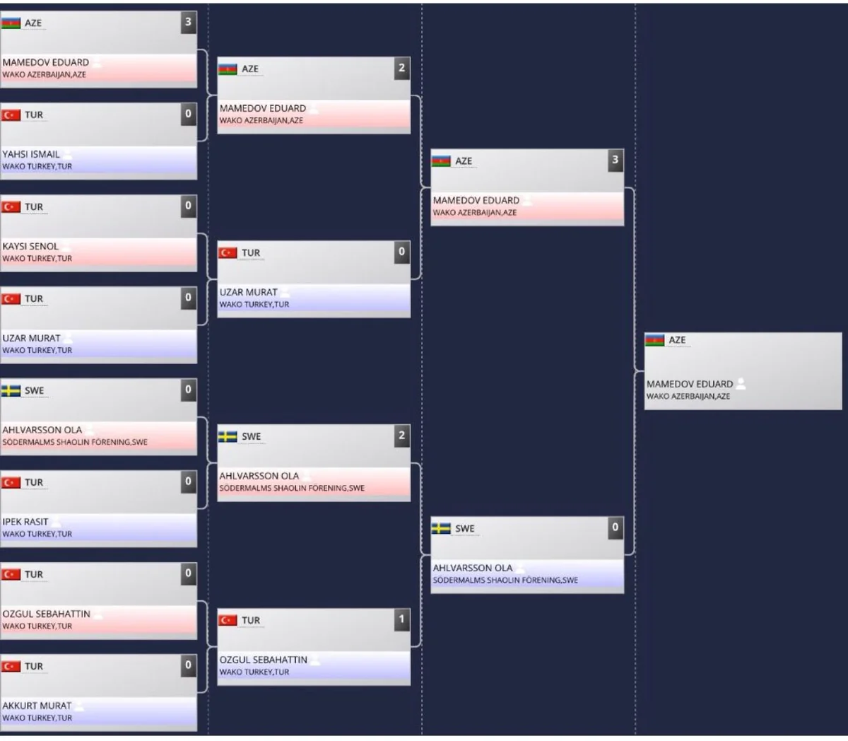 O, finalda İsveç idmançısı Ahlvarsson Olaya qalib gələrək iki qızıl medal qazanıb. Bununla da təmsilçimiz WAKO versiyası üzrə Dünya Kubokunun 11 qat qalibi olub.