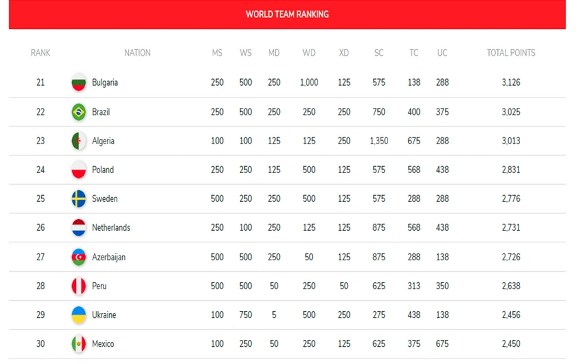 Azərbaycanın badminton üzrə milli komandası Dünya Badminton Federasiyasının açıqladığı yeni reytinq siyahısında 121 ölkə arasında 27-ci sıraya yüksəlib.