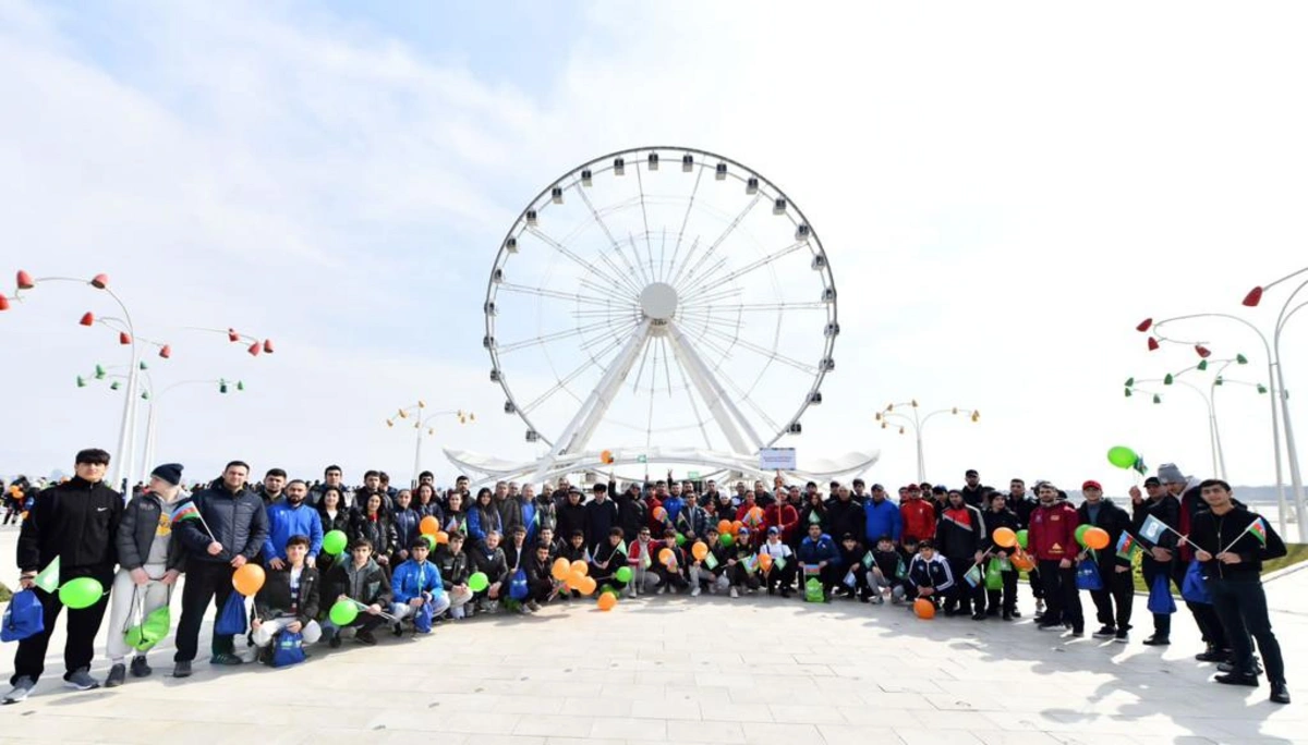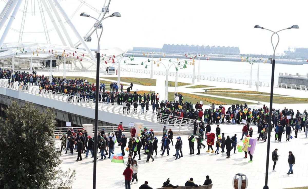 Əvvəlcə minlərlə parad iştirakçısı Dənizkənarı bulvarda, “Şeytan çarxı”nın (Bakının gözü) qarşısından “Dinamo" parkınadək yürüş ediblər. Paradda üçrəngli bayrağımızı Olimpiya çempionu Elnur Məmmədli aparıb.