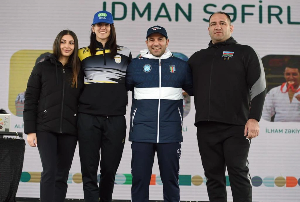 İdman Səfirlərinin (Aynur İmanova, Hacı Əliyev, Maksim Medvedev, Tofiq Musayev, Elnur Məmmədli, İlham Zəkiyev, Aliyə Paşayeva) təqdimatından sonra paralimpiya çempionu İlham Zəkiyev idmançılar adından çıxış edib.