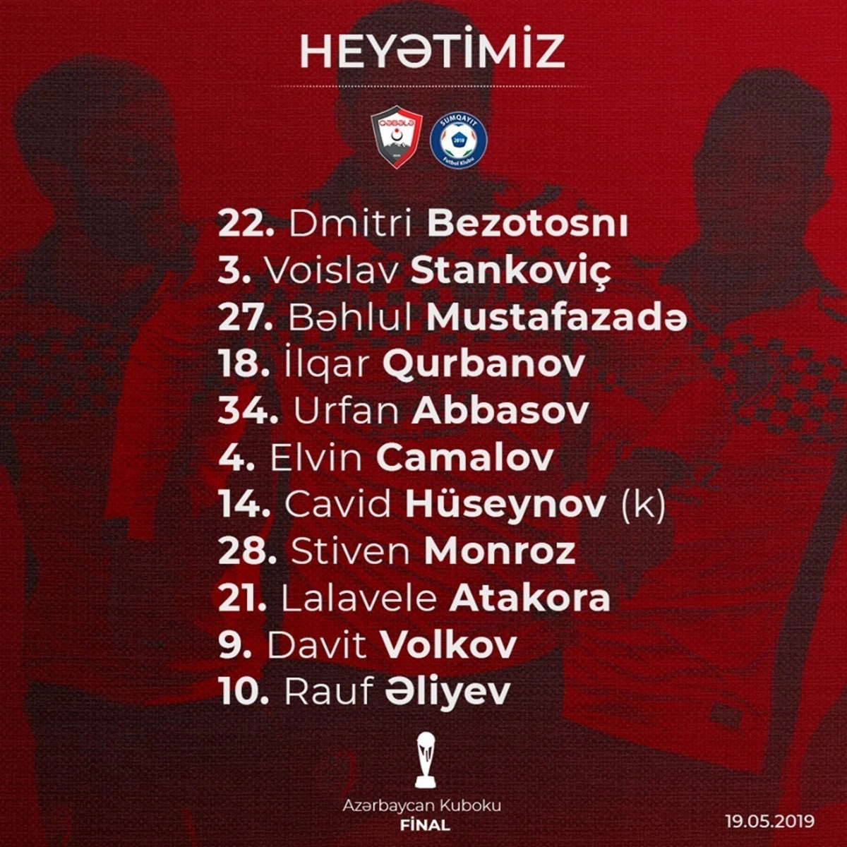 “Qəbələ”: 22. Dmitro Bezotosnı 34. Urfan Abbasov 18. İlqar Qurbanov 14. Cavid Hüseynov (k) 4. Elvin Camalov 10. Rauf Əliyev 3. Voislav Stankoviç 21. Atakora Lalavele 28. Stiven Monroz 9. Davit Volkov 27. Bəhlul Mustafazadə