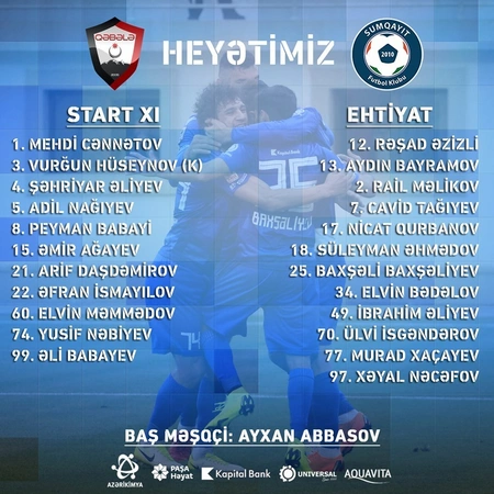 “Sumqayıt”: 1. Mehdi Cənnətov 4. Şəhriyar Əliyev 21. Arif Daşdəmirov 3. Vurğun Hüseynov (k) 99. Əli Babayev 60. Elvin Məmmədov 22. Əfran İsmayılov 5. Adil Nağıyev 8. Peyman Babayi 15. Əmir Ağayev 74. Yusif Nəbiyev