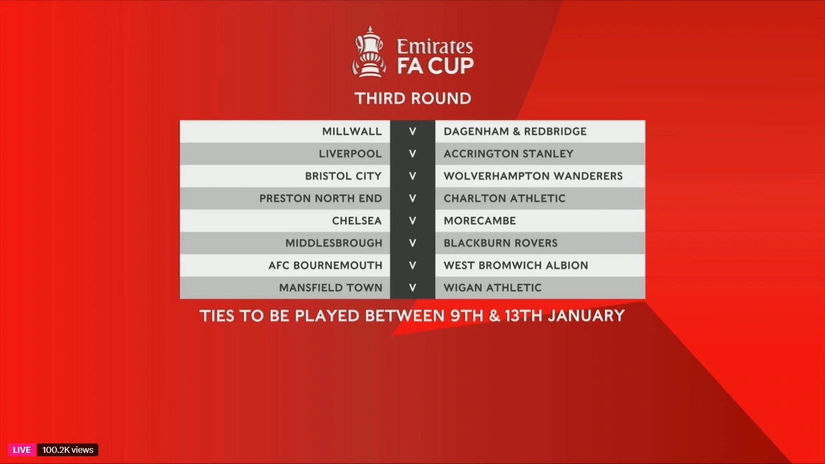 Bundan başqa, Premyer Liqanın vahid lideri “Liverpul” Liqa 2-də (səviyyəcə üçüncü liqa) çıxış edən “Akkrinqton” ilə qarşılaşacaq. “Mançester Siti” “Selford Siti”ni (Liqa 2), “Çelsi” “Morkam”ı (Liqa 2), “Tottenhem” isə “Tamuert”i (Milli Liqa – səviyyəcə beşinci liqa) sınağa çəkəcək. “Şəhərlilər” və “zadəganlar” evdə, “mahmızlar” isə səfərdə oynayacaqlar.