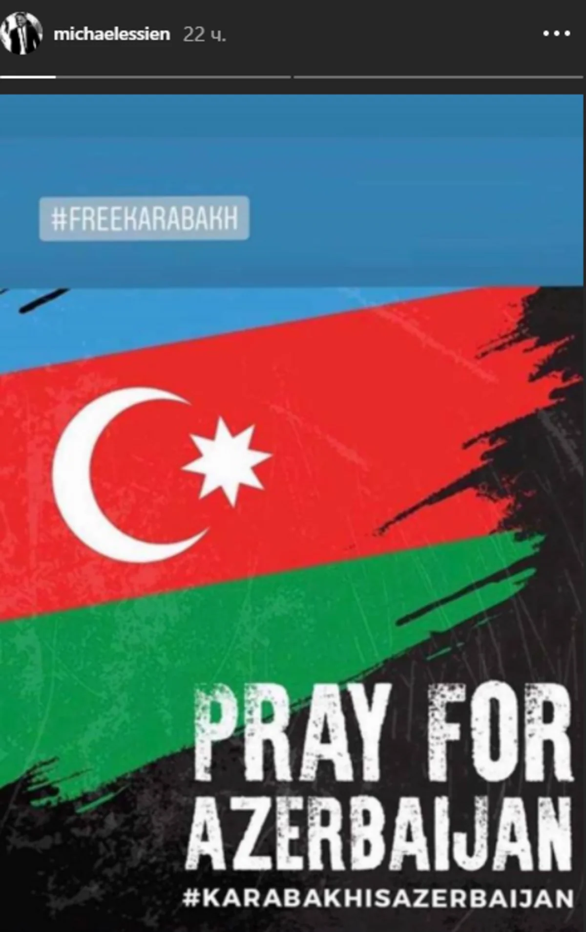 Qana millisinin keçmiş üzvü "Pray for Azerbaijan" ("Dualarım Azərbaycan üçündür"), "Karabakh is Azerbaijan" ("Qarabağ" - Azərbaycandır") yazılan Azərbaycan bayrağını paylaşıb.