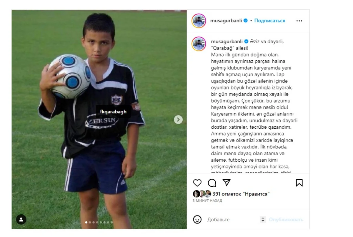 Əziz və dəyərli, “Qarabağ” ailəsi! “Qarabağ” bir futbol klubundan çox daha artıqdır. "Qarabağ" bir ailə, məktəbdir. Haqqınızı halal edin, hamınız üçün darıxacağam, görüşənədək", - gənc forvard yazıb.