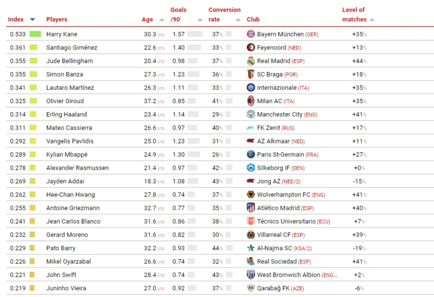 İlk sırada Almaniyanın "Bavariya" klubunda çıxış edən ingiltərəli Harri Keyn (0,533) yer alıb. Niderlandın “Feyenoord” klubundan Santyaqo Ximenes (0,361) ikinci, İspaniyanın "Real" komandasından Cud Bellinqem (0,355) üçüncüdür.