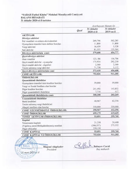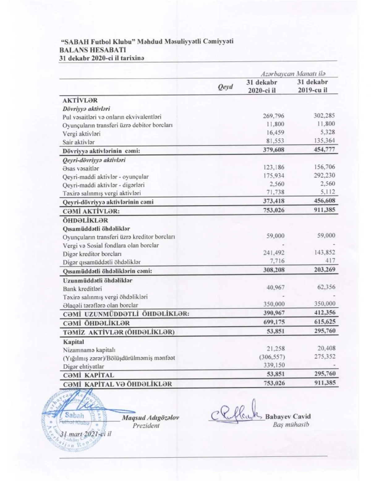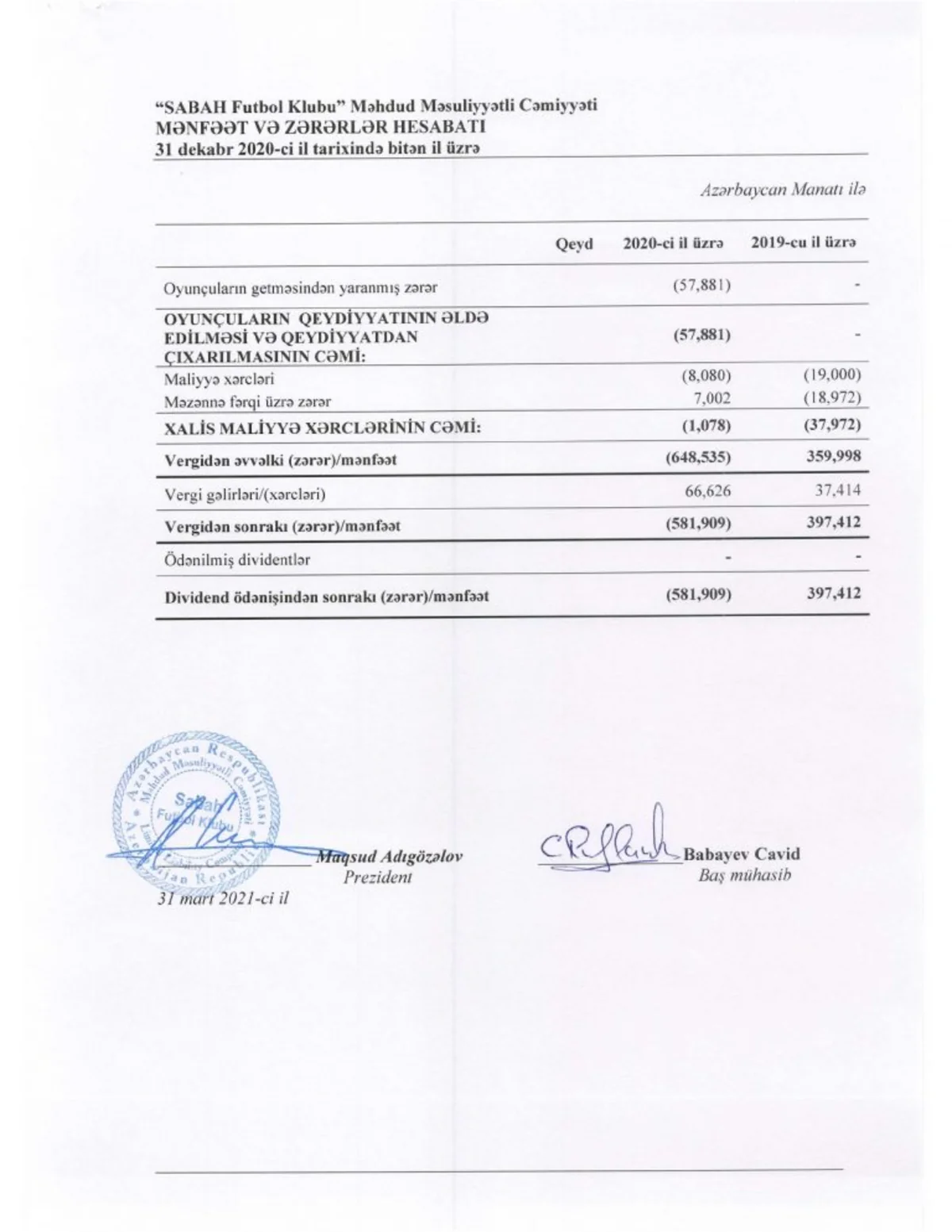 Futbol üzrə Azərbaycan Premyer Liqasında çıxış edən "Sabah" klubu 2020-ci ili 582 000 manat xalis zərərlə başa vurub.