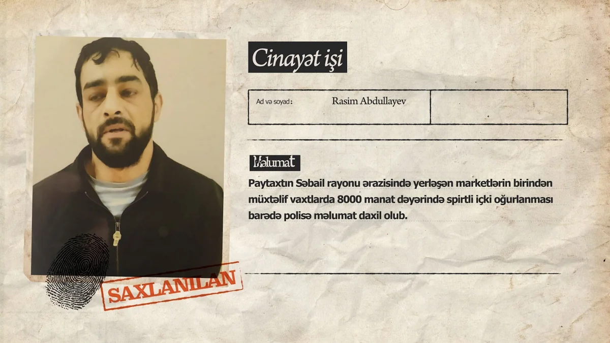 Bildirilib ki, Səbail Rayon Polis İdarəsinin 41-ci Polis Bölməsinin əməkdaşlarının həyata keçirdikləri tədbirlərlə hadisəni törədən paytaxt sakini əvvəllər oğurluq, soyğunçuluq və narkotik cinayətlərinə görə məhkum olunmuş Rasim Abdullayev saxlanılıb.