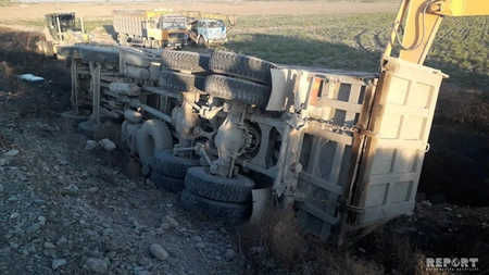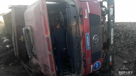 Ağsu rayonunda yük avtomobilinin təkərinin partlaması yol qəzasına səbəb olub.