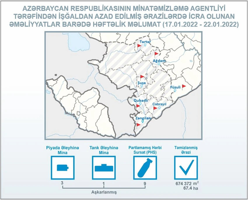 ANAMA-dan "Report"a verilən məlumata görə, yanvarın 17-dən 22-dək Tərtər, Ağdam, Füzuli, Şuşa, Qubadlı, Cəbrayıl və Zəngilanda aparılan minatəmizləmə əməliyyatları zamanı piyada əleyhinə 3, tank əleyhinə 1 mina və 9 partlamamış hərbi sursat aşkarlanaraq zərərsizləşdirilib.